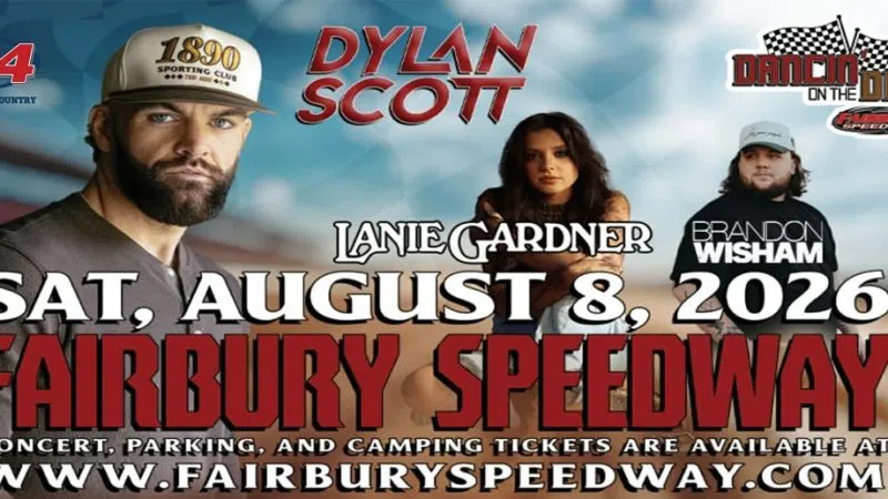 B104, along with the Fairbury Speedway, presents Dylan Scott for the 5th Annual Dancin' on the Dirt! August 8, 2026 in Fairbury, Il at the Fairbury Speedway! Tickets are on sale NOW! Fairbury Speedway presents the 5th Annual Dancin' on the Dirt, Saturday, August 8, 2026, in Fairbury, Illinois. Enjoy three top country m...