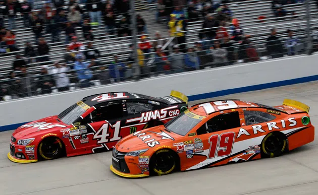 DOVER, DE - OCTOBER 04: Kurt Busch, driver of the #41 Haas Automation Chevrolet, races Carl Edwards, driver of the #19 ARRIS Toyota, during the NASCAR Sprint Cup Series AAA 400 at Dover International Speedway on October 4, 2015 in Dover, Delaware. (Photo by Brian Lawdermilk/Getty Images)