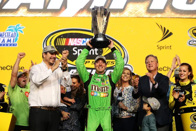 HOMESTEAD, FL - NOVEMBER 22: Kyle Busch, driver of the #18 M&M's Crispy Toyota, celebrates with the trophy in Victory Lane after winning the series championship and the NASCAR Sprint Cup Series Ford EcoBoost 400 at Homestead-Miami Speedway on November 22, 2015 in Homestead, Florida. (Photo by Chris Graythen/Getty Images)