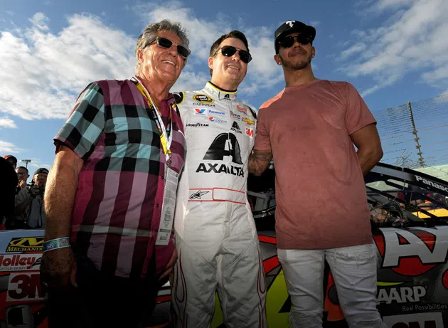 HOMESTEAD, FL - NOVEMBER 22: Former racing driver Mario Andretti, Jeff Gordon, driver of the #24 AXALTA Chevrolet, and Formula One World Champion Lewis Hamilton pose during pre-race ceremonies for the NASCAR Sprint Cup Series Ford EcoBoost 400 at Homestead-Miami Speedway on November 22, 2015 in Homestead, Florida. (Photo by Jared C. Tilton/NASCAR via Getty Images)